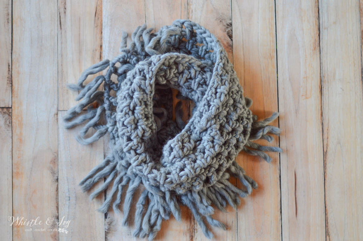 This simple scarf is cozy and warm, and has added fringe for winter style!