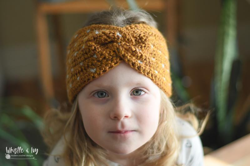 This darling headband has a twist front detail and easy knit-look stitches in contrasting colors.